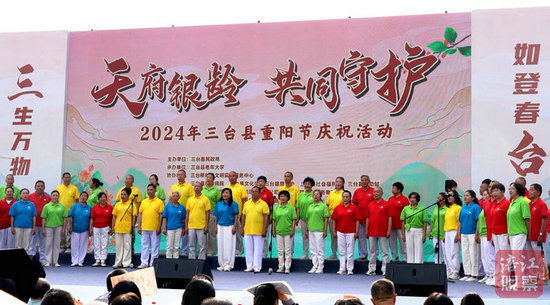 ?。保霸拢保叭障挛?,以“天府銀齡 共同守護(hù)”為主題的重陽(yáng)慶典在三臺(tái)縣潼川古城梓州渡廣場(chǎng)舉行。