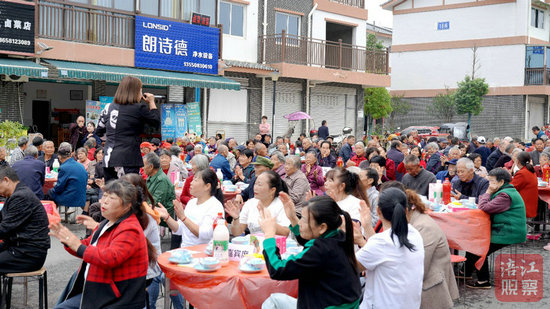 活動(dòng)現(xiàn)場(chǎng),村民們載歌載舞頌歌新時(shí)代,歡度重陽(yáng)節(jié)。節(jié)目表演結(jié)束后,老人們圍坐在一起,吃壩壩宴、嘮家常,流淌著濃濃的幸福味道。