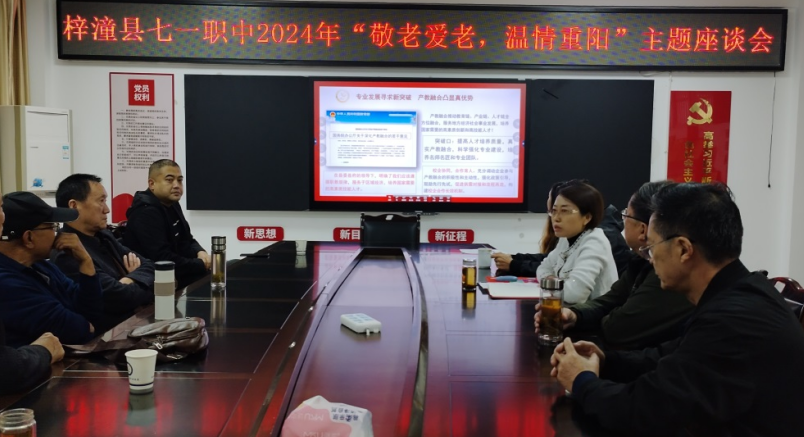 在重陽節(jié)之際,梓潼縣“七一”高級職業(yè)中學(xué)舉行了以“敬老愛老,溫情重陽”為主題的2024年重陽節(jié)座談會及系列活動,該校黨支部書記、校長梁金蓉、副校長王桂平、陳超等校領(lǐng)導(dǎo)同受邀請的退休老教師一道歡度重陽節(jié)。