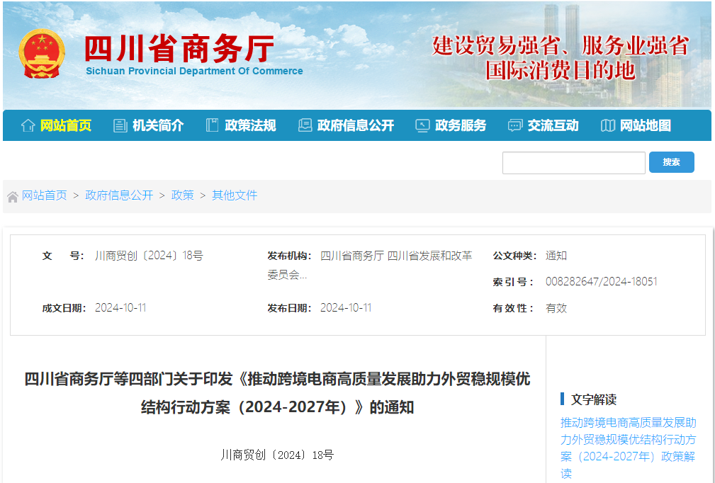 四川省商務(wù)廳等四部門關(guān)于印發(fā)《推動跨境電商高質(zhì)量發(fā)展助力外貿(mào)穩(wěn)規(guī)模優(yōu)結(jié)構(gòu)行動方案(2024-2027年)》的通知