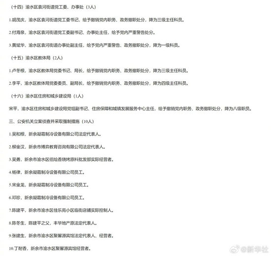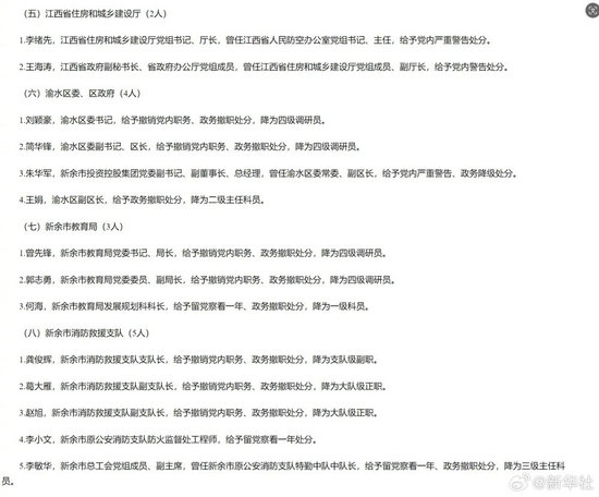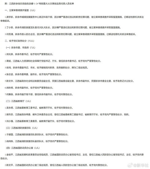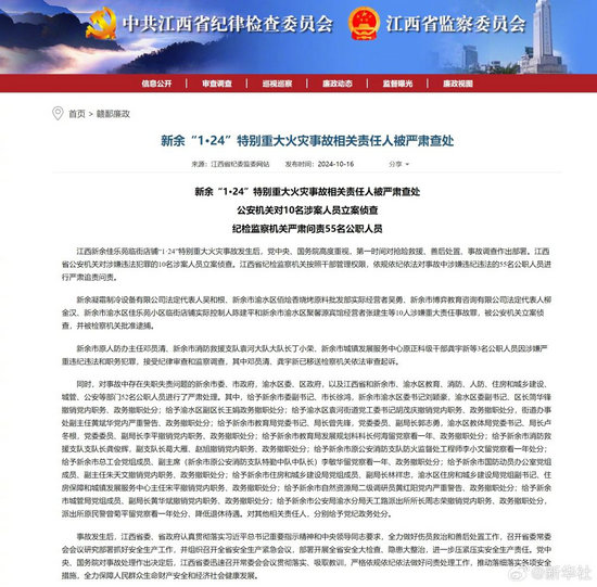 【江西新余特大火災(zāi)事故追責(zé)問責(zé)人員名單公布】2024年1月24日15時22分,江西省新余市渝水區(qū)佳樂苑小區(qū)臨街商住綜合樓發(fā)生特別重大火災(zāi)事故。江西省公安機(jī)關(guān)對涉嫌違法犯罪的10名涉案人員立案偵查。江西省紀(jì)檢監(jiān)察機(jī)關(guān)按照干部管理權(quán)限,依規(guī)依紀(jì)依法對事故中涉嫌違紀(jì)違法的55名公職人員進(jìn)行嚴(yán)肅追責(zé)問責(zé)。10月16日,江西省紀(jì)委監(jiān)委公布了新余特別重大火災(zāi)事故追責(zé)問責(zé)人員名單。(記者:賴星)
