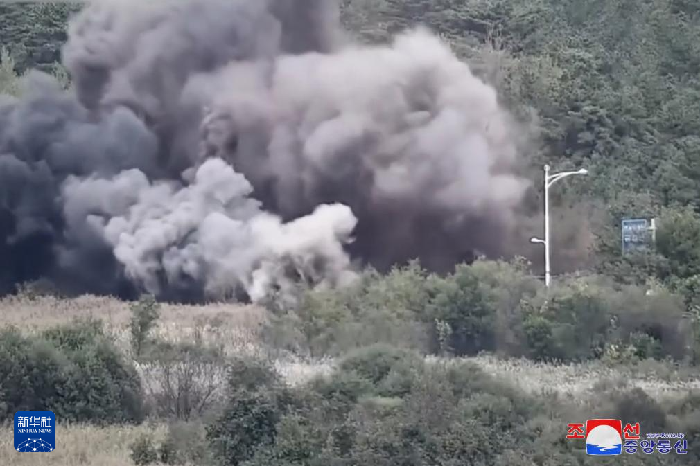 這張朝中社提供的照片顯示的是,朝方以爆破方式封閉公路。新華社/朝中社