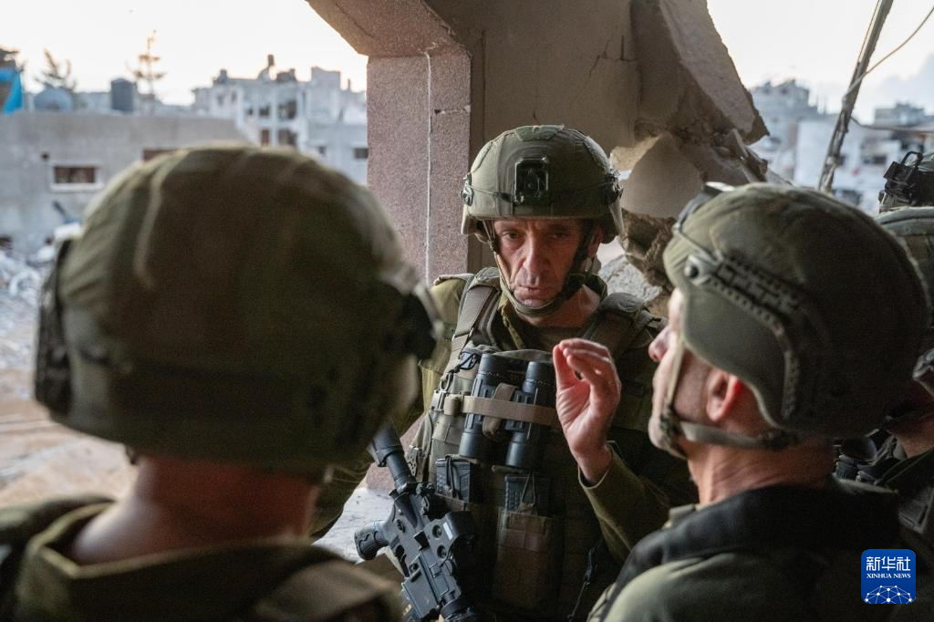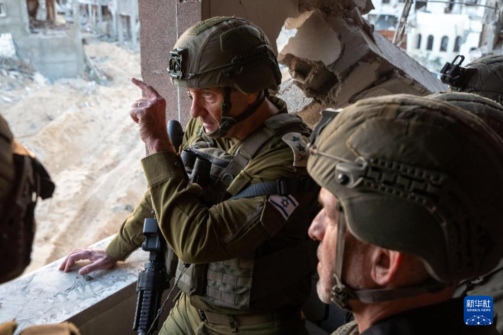 10月17日,以色列國防軍總參謀長哈萊維(中)在加沙地帶辛瓦爾死亡地點(diǎn)附近視察。新華社發(fā)(以色列國防軍供圖)