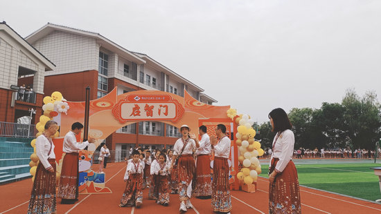 富樂三小的歡樂運(yùn)動場上,一年級新生身著中國傳統(tǒng)漢服,精神抖擻,在老師的陪伴下,揮舞著雙手,走過啟智門。該校校長蔣義為孩子的“開筆禮”致辭發(fā)表了熱情洋溢的致辭。