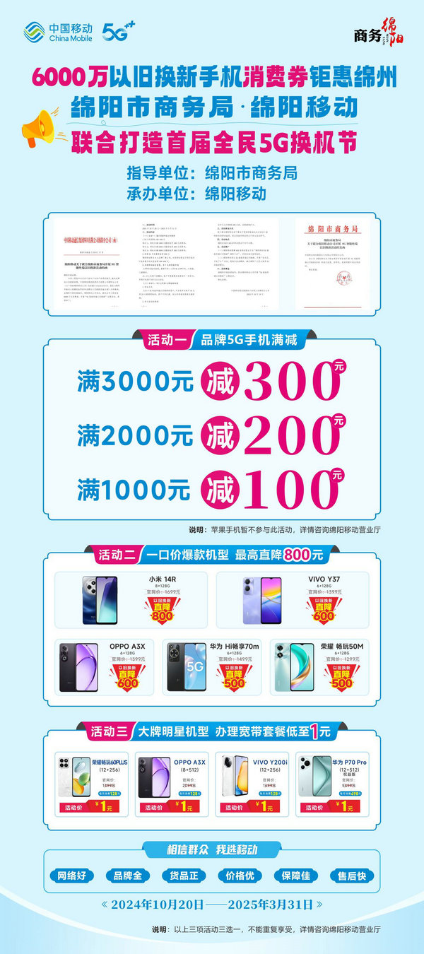 即日起,綿陽首屆全民5G換機(jī)節(jié)正式開啟,綿陽市商務(wù)局聯(lián)合綿陽移動面向全市人民發(fā)放6000萬元手機(jī)消費(fèi)券。