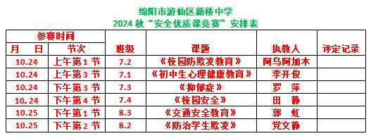 綿陽新聞網(wǎng)訊 為了認真落實《綿陽市游仙區(qū)教育體育局關于開展2024年中小學(幼兒園)安全教育優(yōu)質(zhì)課競賽活動的通知》相關工作安排,推動學校安全教育課程建設,展示新時代安全教育教師隊伍的綜合素質(zhì),提高師生珍愛生命意識,促進教師專業(yè)成長,10月24日至10月25日,游仙區(qū)新橋中學開展了以“立足安全課堂 聚焦核心素養(yǎng)?”為主題的2024年秋安全優(yōu)質(zhì)課競賽【推選】活動。