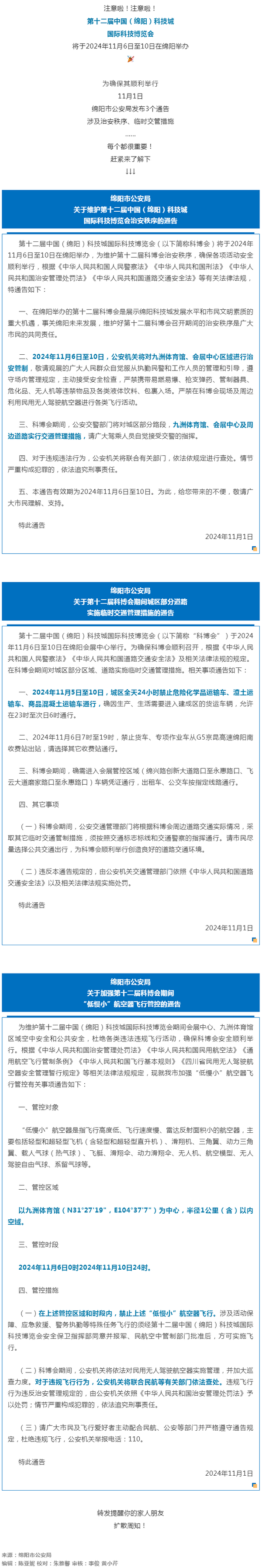 第十二屆中國(綿陽)科技城國際科技博覽會(以下簡稱科博會)將于2024年11月6日至10日在綿陽舉辦,為維護第十二屆科博會治安秩序,確保各項活動安全順利舉行,根據(jù)《中華人民共和國人民警察法》《中華人民共和國刑法》《中華人民共和國治安管理處罰法》《中華人民共和國道路交通安全法》等有關法律法規(guī),特通告。
