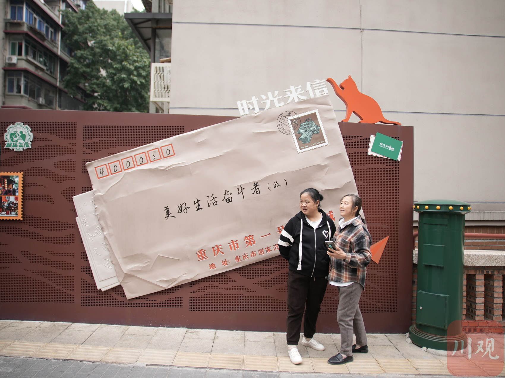 民主村社區(qū),兩名游客拍照留念。
