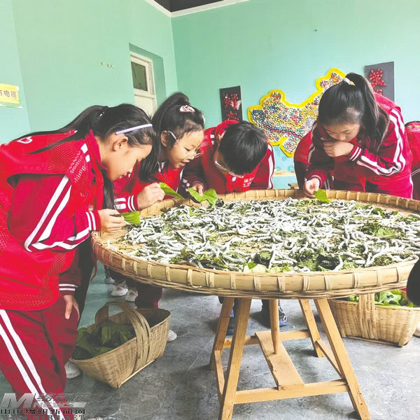 孩子們在研學(xué)活動中體驗喂蠶