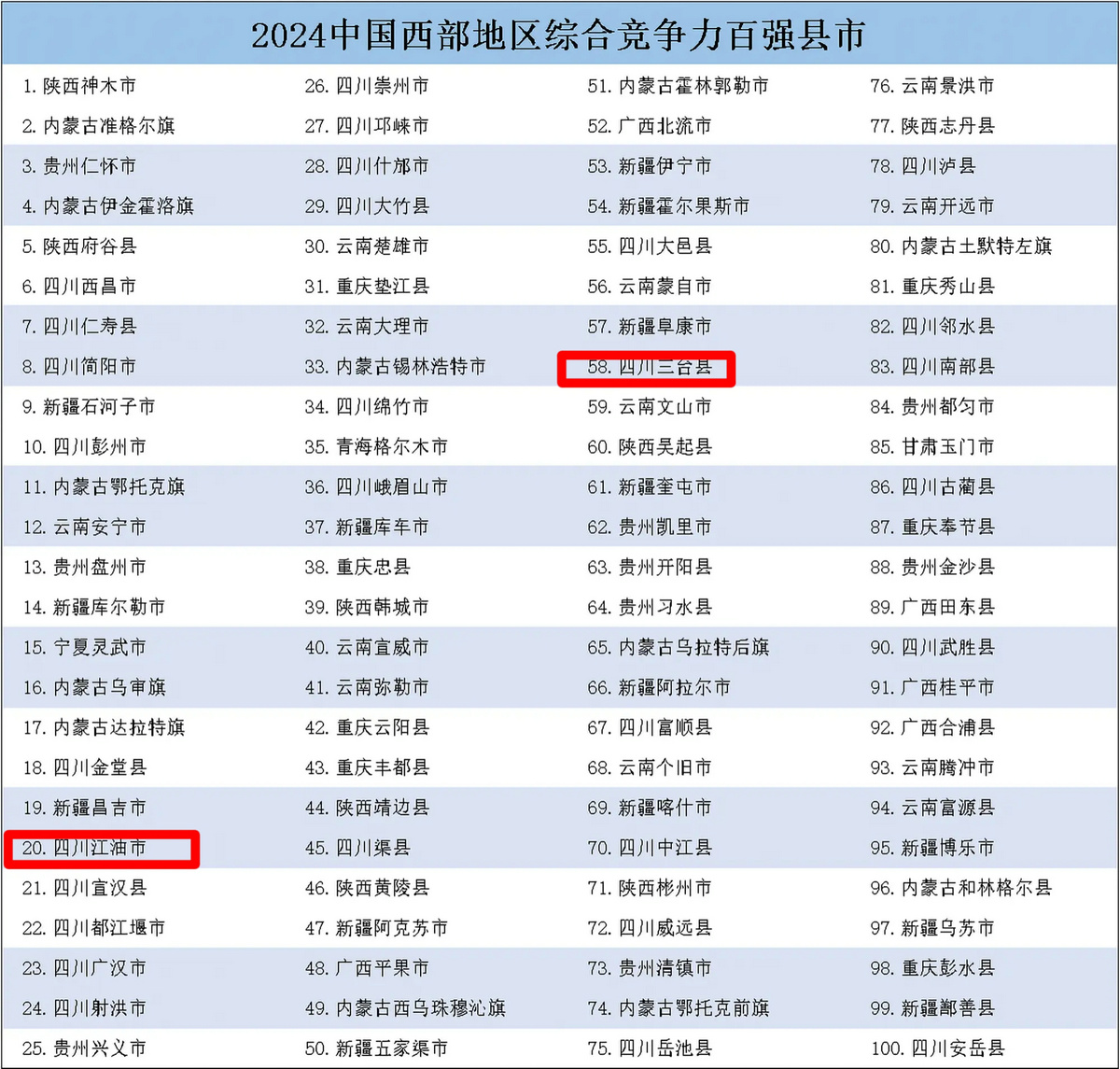 綿陽(yáng)4地上榜!2024中國(guó)西部百?gòu)?qiáng)區(qū)、百?gòu)?qiáng)縣市名單揭曉