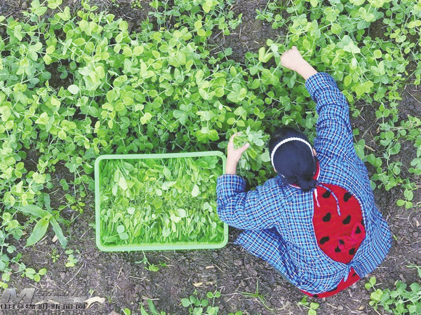 豌豆尖不僅給市民餐桌上增添了一道新鮮的“限定”美味,也為當(dāng)?shù)卮迕駧砹耸找妗U诿β档凝R心村村民曹碧蓉說:“采摘豌豆尖都是用手‘掐’,只要上面嫩的部分,我現(xiàn)在靠‘掐’豌豆尖每天都能掙到100多元。”