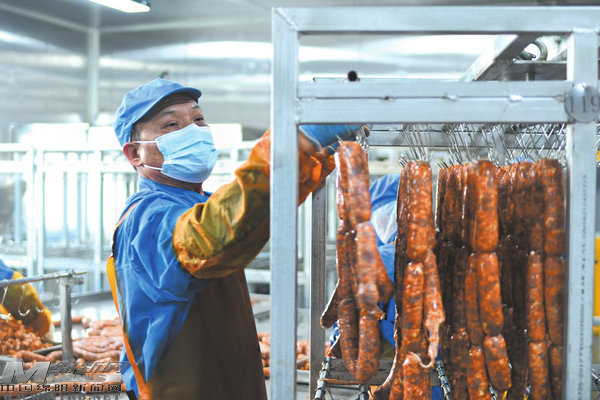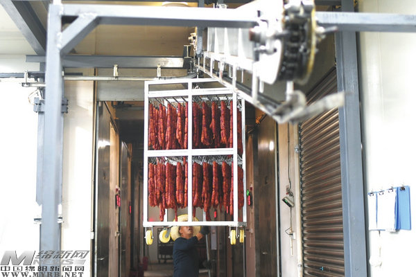 記者在這條生產(chǎn)線看到,豬肉經(jīng)機(jī)械全自動解凍清洗后,送入拌料車間,然后抵達(dá)灌裝車間,工人對香腸進(jìn)行灌制,排氣和整理。灌制好的香腸進(jìn)入烘干房,烘干后再進(jìn)行煙熏,最后是包裝,整個(gè)生產(chǎn)線有序流動,現(xiàn)場有條不紊,快捷高效。