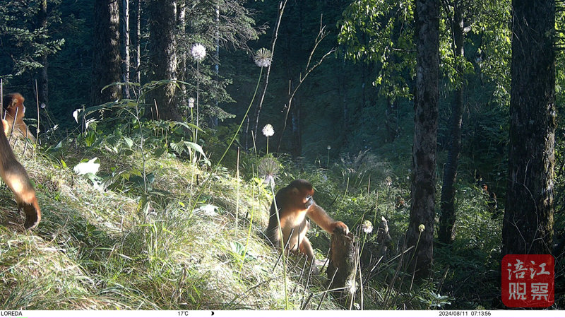 不遠處,幾只幼年金絲猴在樹枝間跳躍玩耍,為這溫馨的曬娃場景增添了不少歡樂的氛圍。