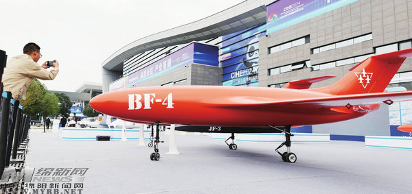 第十二屆中國(綿陽)科技城國際科技博覽會上展示的暴風-4無人機。(記者任明勇攝)