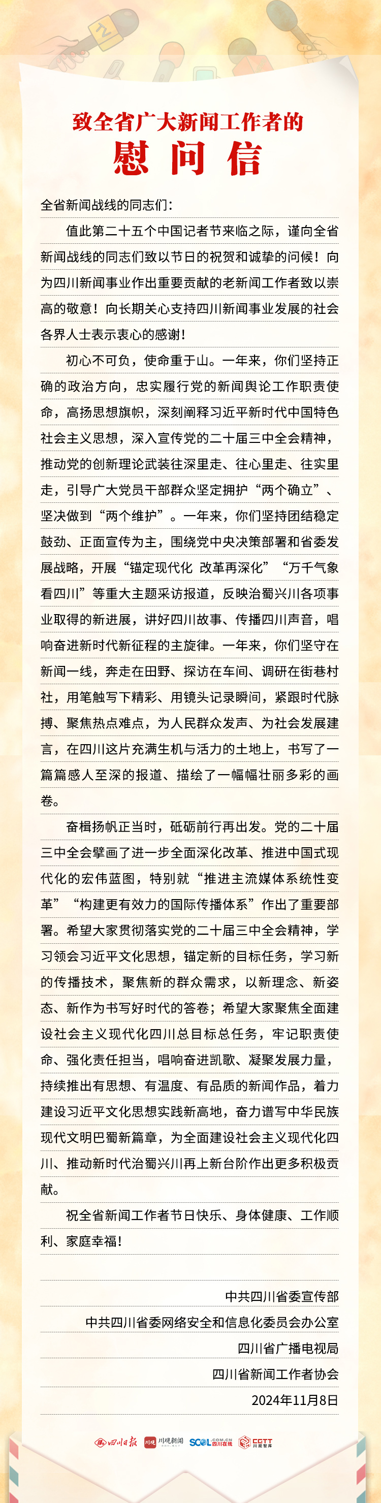 奮楫揚(yáng)帆正當(dāng)時(shí),砥礪前行再出發(fā)。黨的二十屆三中全會(huì)擘畫了進(jìn)一步全面深化改革、推進(jìn)中國(guó)式現(xiàn)代化的宏偉藍(lán)圖,特別就“推進(jìn)主流媒體系統(tǒng)性變革”“構(gòu)建更有效力的國(guó)際傳播體系”作出了重要部署。希望大家貫徹落實(shí)黨的二十屆三中全會(huì)精神,學(xué)習(xí)領(lǐng)會(huì)習(xí)近平文化思想,錨定新的目標(biāo)任務(wù),學(xué)習(xí)新的傳播技術(shù),聚焦新的群眾需求,以新理念、新姿態(tài)、新作為書寫好時(shí)代的答卷;希望大家聚焦全面建設(shè)社會(huì)主義現(xiàn)代化四川總目標(biāo)總?cè)蝿?wù),牢記職責(zé)使命、強(qiáng)化責(zé)任擔(dān)當(dāng),唱響奮進(jìn)凱歌、凝聚發(fā)展力量,持續(xù)推出有思想、有溫度、有品質(zhì)的新聞作品,著力建設(shè)習(xí)近平文化思想實(shí)踐新高地,奮力譜寫中華民族現(xiàn)代文明巴蜀新篇章,為全面建設(shè)社會(huì)主義現(xiàn)代化四川、推動(dòng)新時(shí)代治蜀興川再上新臺(tái)階作出更多積極貢獻(xiàn)。
