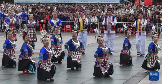 當(dāng)日,湘黔桂三省(區(qū))侗族群眾聚集在廣西三江侗族自治縣多耶廣場(chǎng),載歌載舞,歡慶侗族多耶節(jié)。