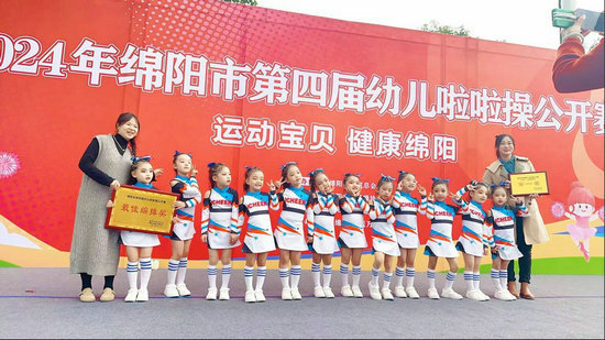 綿陽新聞網(wǎng)訊 11月9日,2024年綿陽市第四屆幼兒啦啦操公開賽正式落下帷幕。由鹽亭縣岐伯幼兒園12名幼兒組成的啦啦操代表隊,經(jīng)過激烈地角逐,最終以總分第一的優(yōu)異成績榮獲自選動作——自編舞蹈啦啦操第一名和最佳編排獎。