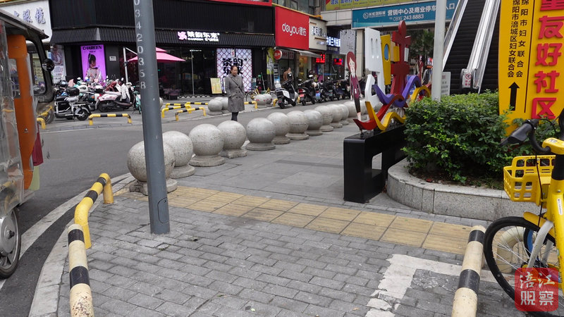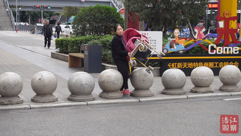 記者實(shí)地走訪,在涪城區(qū)長(zhǎng)虹國(guó)際廣場(chǎng)的人行道上看到,阻車(chē)的石墩如同棋盤(pán)上的棋子般緊湊排列。市民們?cè)诖颂幫ㄐ袝r(shí),遭遇諸多困擾,正常行走時(shí)雙腳都要小心翼翼地卡著石墩間的狹小縫隙才能通過(guò),而那些推著嬰兒車(chē)的市民則只能將嬰兒車(chē)抬高通行。“我每次帶寶寶出來(lái)散步,走到這兒都得把嬰兒車(chē)抬起來(lái),特別費(fèi)勁。”市民王女士說(shuō)。