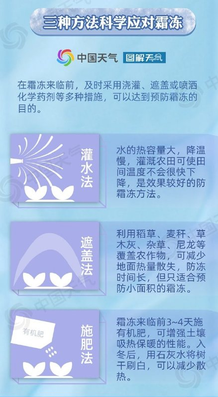 綿陽市氣象臺提醒,請注意采取防御凍害的措施,防范霜凍對農(nóng)牧業(yè)帶來的不利影響,并注意用火、用電、用氣和出行安全。