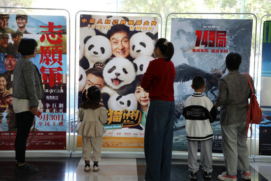 10月7日,觀眾在山東省博興縣一家影城觀看電影海報(bào)。新華社發(fā)(陳彬攝)