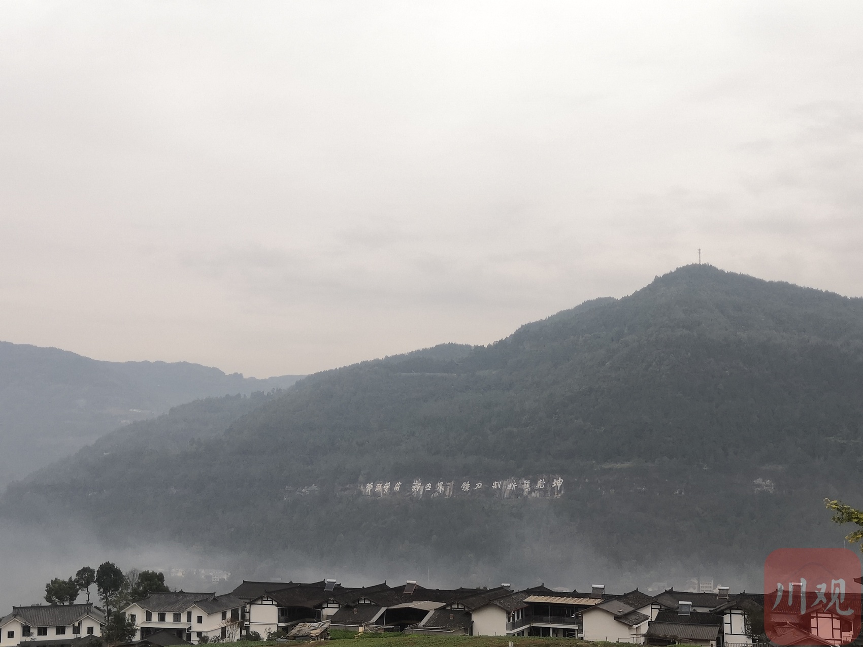 王坪村民居和刻在山上的紅色標(biāo)語(yǔ)。