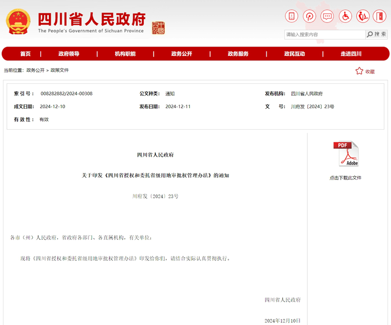 12月11日,四川省人民政府印發(fā)《四川省授權(quán)和委托省級(jí)用地審批權(quán)管理辦法》(以下簡稱《管理辦法》),將省政府權(quán)限內(nèi)的農(nóng)用地、未利用地轉(zhuǎn)用審批權(quán)和土地征收審批權(quán)、使用掛鉤指標(biāo)報(bào)征審批權(quán)、土地征收成片開發(fā)方案審批權(quán)授權(quán)和委托市(州)行使,賦予市(州)政府更大用地自主權(quán),該辦法自發(fā)布之日起施行。