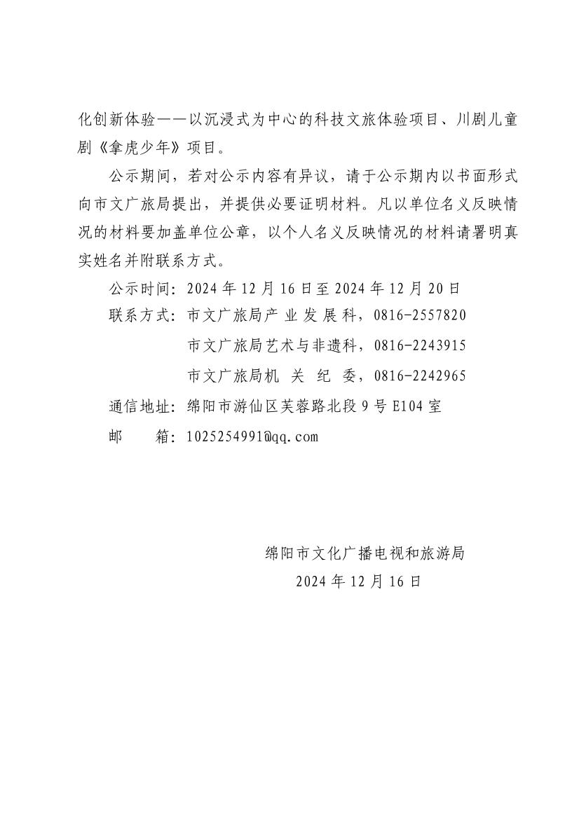 綿陽市文化廣播電視和旅游局 2024年市級文化和旅游融合發(fā)展專項(xiàng)資金(產(chǎn)業(yè)扶持類)擬支持項(xiàng)目名單公示