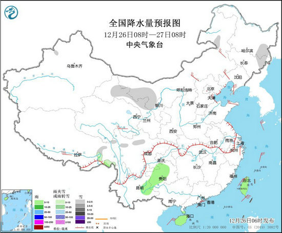 全國(guó)降水量預(yù)報(bào)圖(12月26日08時(shí)-27日08時(shí))