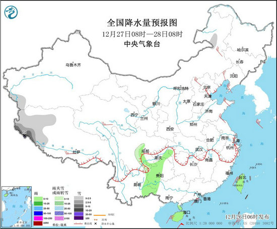 12月27日08時(shí)至28日08時(shí),新疆南疆盆地西部、西藏北部和西南部、川西高原南部等地部分地區(qū)有小到中雪或雨夾雪,其中,西藏西南部等地部分地區(qū)有大到暴雪,局地大暴雪(20~25毫米)。湖北西南部、重慶東南部、四川盆地西部和東南部、貴州中西部、云南東部、廣西西北部、海南島、臺(tái)灣島等地部分地區(qū)有小雨。西藏中北部、青海南部、內(nèi)蒙古中東部、山西、河北北部、山東半島等地部分地區(qū)有4~6級(jí)風(fēng);渤海南部、渤海海峽、黃海大部海域、東海東部和南部海域、臺(tái)灣海峽、臺(tái)灣以東洋面、巴士海峽、南海北部和中部海域、北部灣將有7~8級(jí)、陣風(fēng)9~10級(jí)的大風(fēng)。