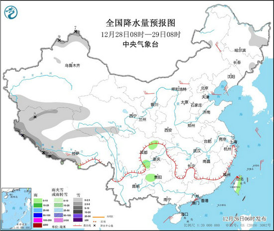 12月28日08時(shí)至29日08時(shí),新疆北疆北部、西藏北部和西南部、青海南部和西部、黑龍江東北部、吉林東部等地部分地區(qū)有小到中雪,其中,新疆北疆北部高海拔地區(qū)、西藏西南部等地部分地區(qū)有大到暴雪,西藏西南部局地大暴雪(20~25毫米)。四川盆地北部和西南部、貴州西南部、臺(tái)灣島東部等地部分地區(qū)有小雨。西藏南部、內(nèi)蒙古中西部、遼東半島、浙江東部沿海等地部分地區(qū)有4~6級(jí)風(fēng);黃海南部海域、臺(tái)灣海峽、臺(tái)灣以東洋面、巴士海峽、南海北部和中部海域、北部灣將有7~8級(jí)、陣風(fēng)9~10級(jí)的大風(fēng)。
