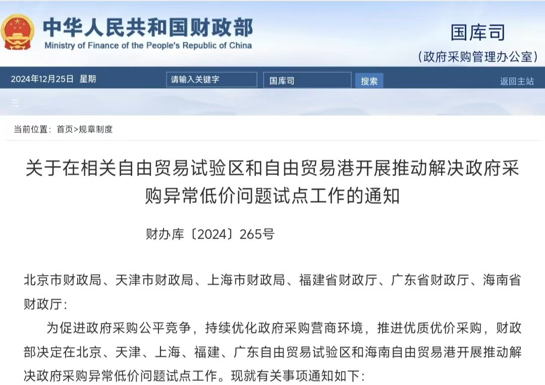 財政部12月25日對外發(fā)布了關于在相關自由貿易試驗區(qū)和自由貿易港開展推動解決政府采購異常低價問題試點工作的通知,明確了上述安排。