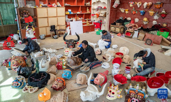 12月9日,拉薩布制面具制作技藝西藏自治區(qū)級(jí)非遺傳承人西洛(中)和同事一起制作西藏傳統(tǒng)面具。西洛是拉薩布制面具制作技藝的西藏自治區(qū)級(jí)非遺傳承人,他制作的面具廣泛運(yùn)用于藏戲表演中。2012年,在政府的扶持下,西洛創(chuàng)辦了拉薩市達(dá)孜區(qū)雪鄉(xiāng)扎西崗傳統(tǒng)手工藝合作社。近年來(lái),合作社不斷吸納當(dāng)?shù)厝罕妼W(xué)習(xí)面具制作技藝,不僅為當(dāng)?shù)厝罕娞峁┚蜆I(yè)機(jī)會(huì),同時(shí)也助力非物質(zhì)文化遺產(chǎn)的保護(hù)和發(fā)展。