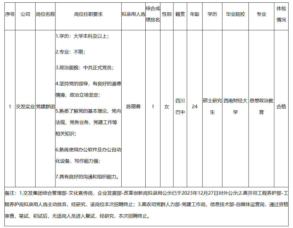 根據(jù)交發(fā)集團發(fā)布的“獵才行動”招聘公告及招聘相關規(guī)定,經(jīng)資格審查、筆試、面試、背景調(diào)查、體檢等程序,擬錄用陳麗蓉到綿陽交發(fā)實業(yè)有限責任公司工作,現(xiàn)予以公示,具體情況如下: