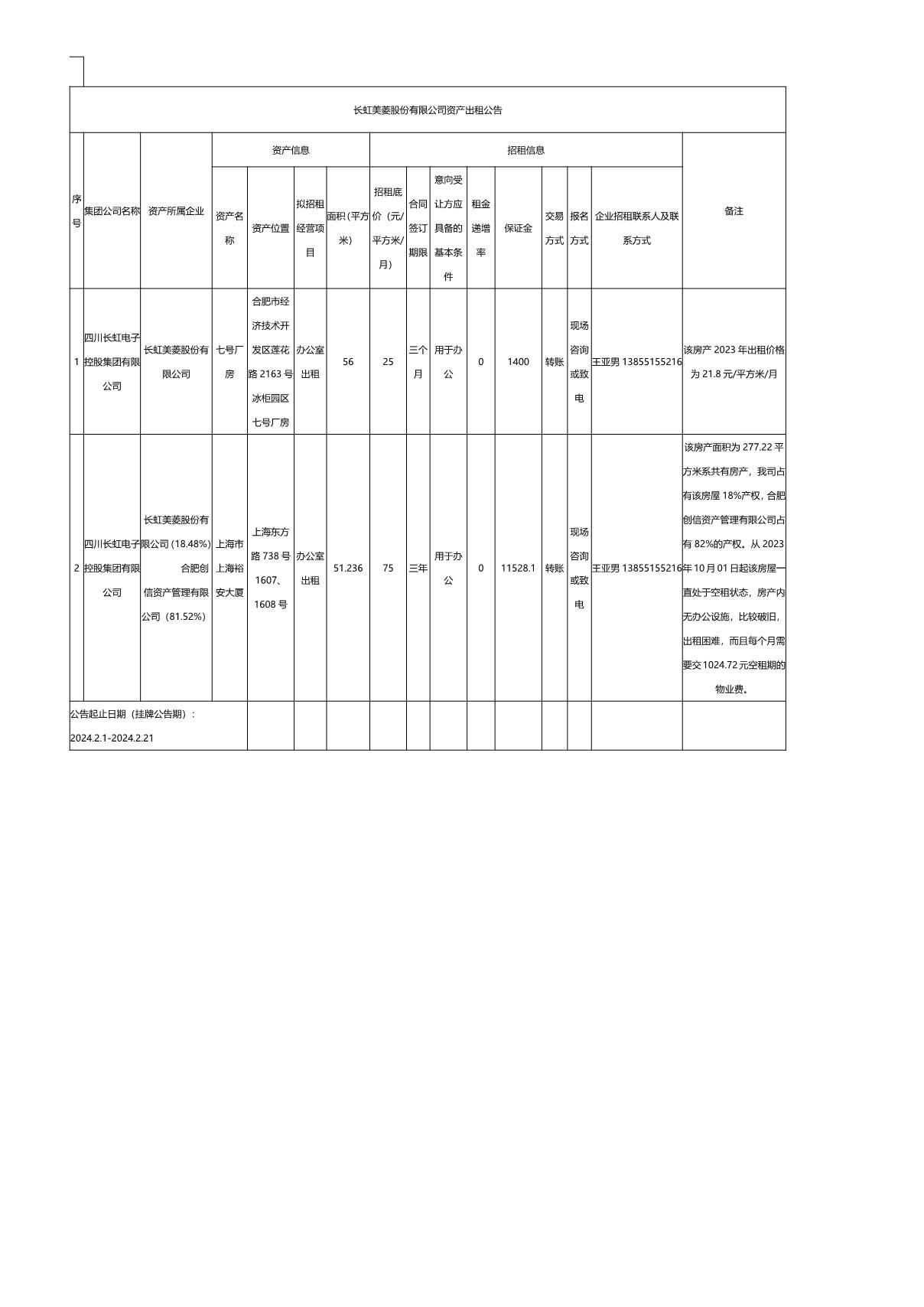 長(zhǎng)虹美菱股份有限公司資產(chǎn)出租公告