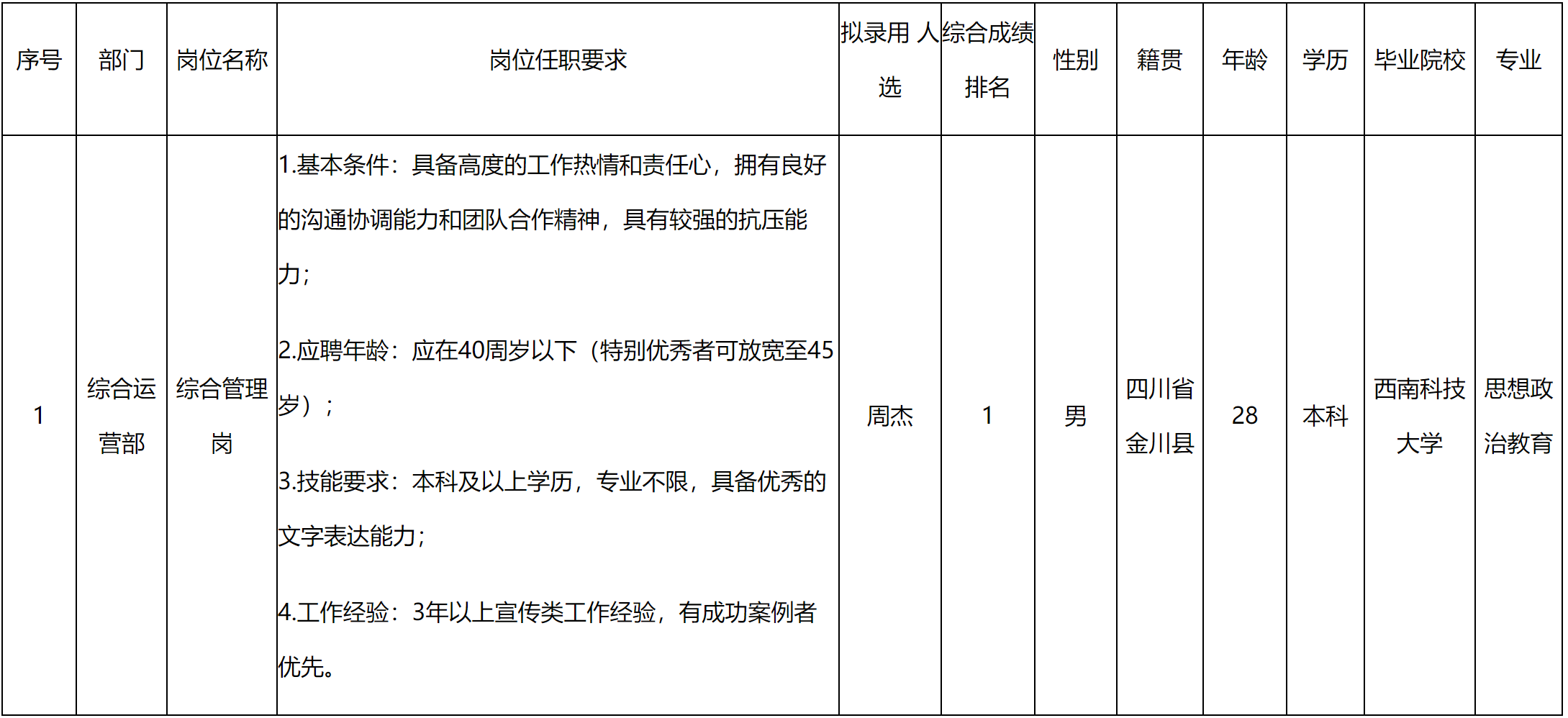 根據(jù)四川九州北斗導(dǎo)航與位置服務(wù)有限公司發(fā)布的招聘公告及招聘相關(guān)規(guī)定,經(jīng)筆試、面試、考察、體檢等程序,擬錄用周杰同志到四川九州北斗導(dǎo)航與位置服務(wù)有限公司工作,現(xiàn)予以公示,具體情況如下: