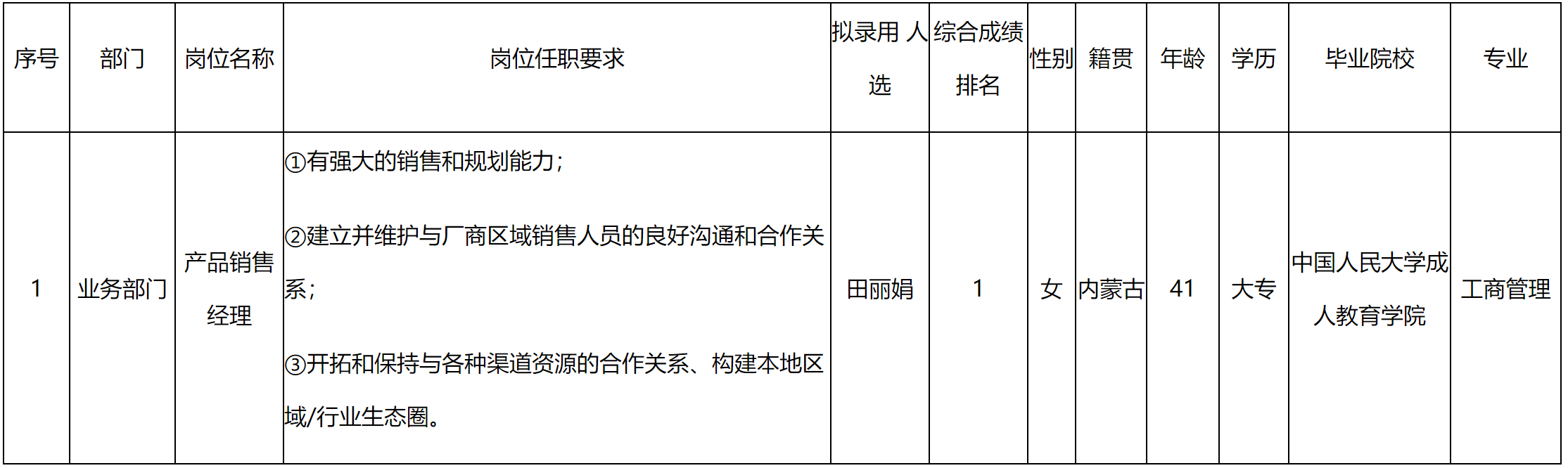 根據(jù)四川長(zhǎng)虹佳華信息產(chǎn)品有限責(zé)任公司發(fā)布的招聘公告及招聘相關(guān)規(guī)定,經(jīng)面試、考察、體檢等程序,擬錄用田麗娟同志到四川長(zhǎng)虹佳華信息產(chǎn)品有限責(zé)任公司工作,現(xiàn)予以公示,具體情況如下: