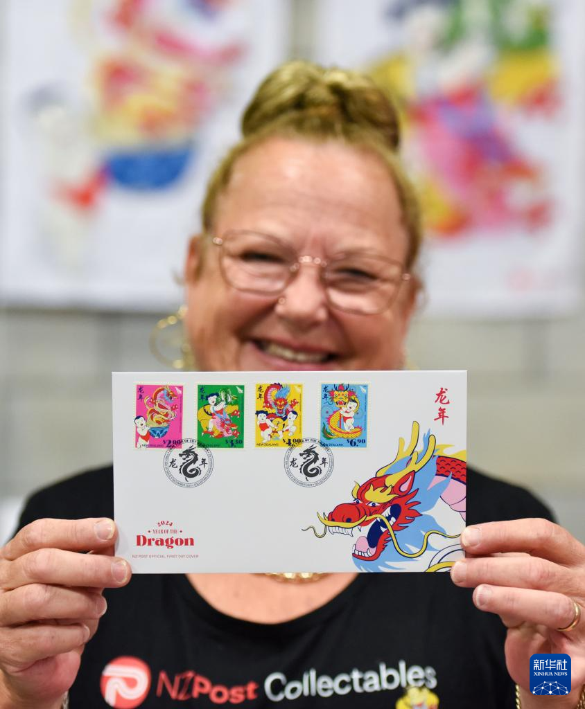 2月3日,在新西蘭奧克蘭,參加“新春花市同樂日”的新西蘭郵政工作人員向記者展示2024龍年生肖郵票。