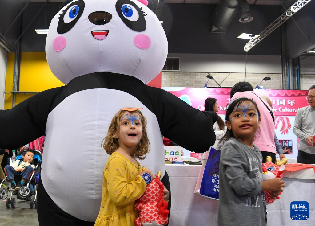 2月3日,在新西蘭奧克蘭,參加“新春花市同樂日”的小朋友抱著“龍寶寶”走過一個“熊貓寶寶”。