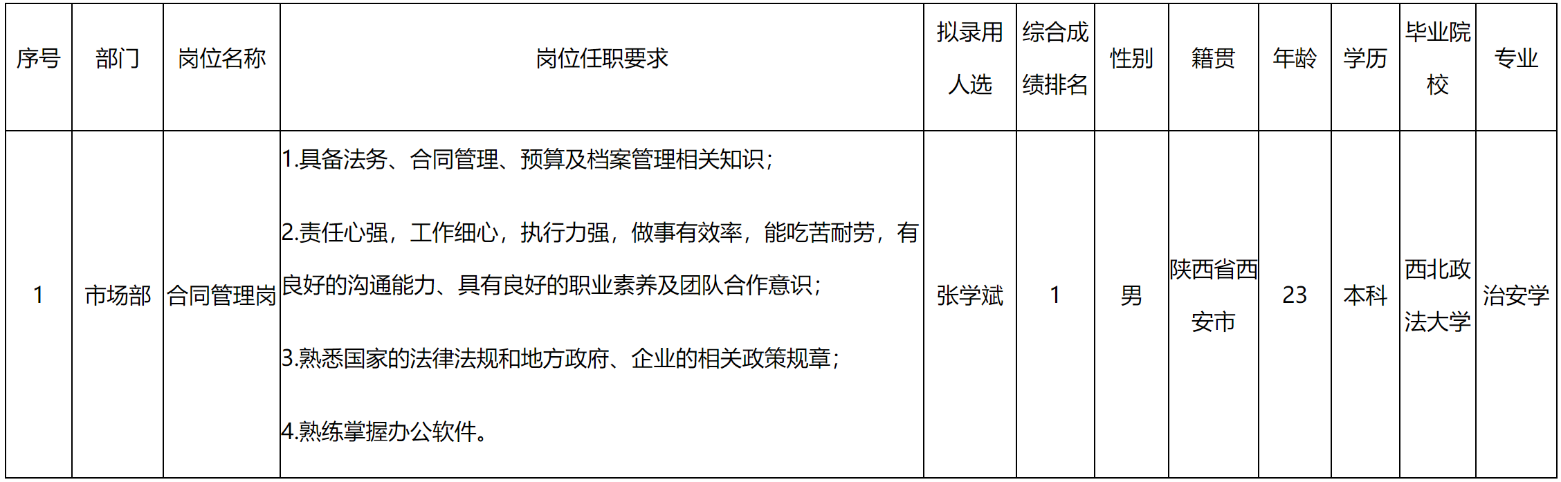 根據(jù)四川九強通信科技有限公司發(fā)布的招聘公告及招聘相關(guān)規(guī)定,經(jīng)筆試、面試、考察、體檢等程序,擬錄用張學(xué)斌同志到四川九強通信科技有限公司工作,現(xiàn)予以公示,具體情況如下:
