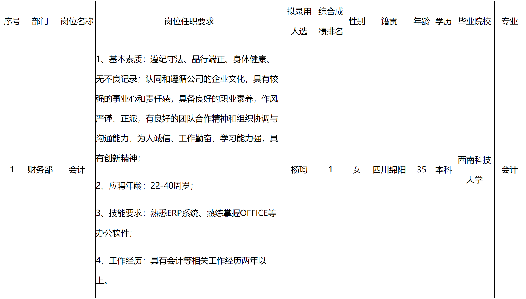 根據(jù)四川長(zhǎng)虹物業(yè)服務(wù)有限責(zé)任公司綿陽(yáng)分公司發(fā)布的招聘公告及招聘相關(guān)規(guī)定,經(jīng)筆試、面試、考察、體檢等程序,擬錄用楊珣同志到財(cái)務(wù)部工作?,F(xiàn)予以公示,具體情況如下:
