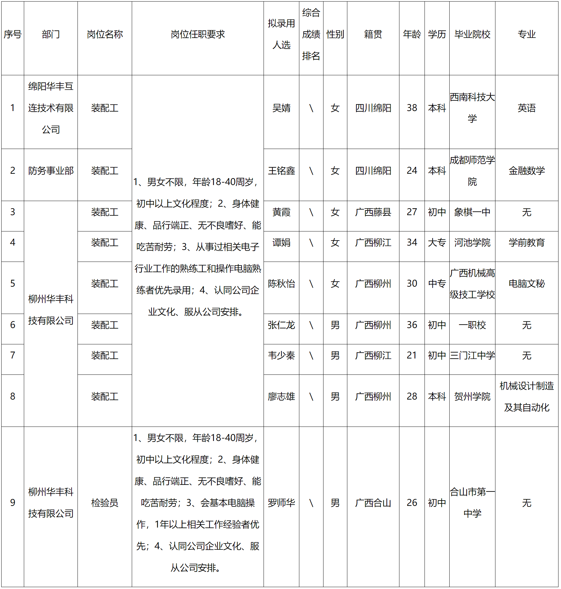 根據(jù)四川華豐科技股份有限公司發(fā)布的招聘公告及招聘相關(guān)規(guī)定,經(jīng)面試、考察、體檢等程序,擬錄用以下9人到四川華豐科技股份有限公司工作,現(xiàn)予以公示,具體情況如下:
