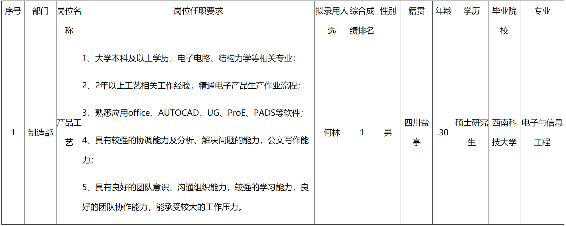 根據(jù)四川長(zhǎng)虹電器股份有限公司(多媒體公司)發(fā)布的招聘公告及招聘相關(guān)規(guī)定,經(jīng)面試、考察、體檢等程序,擬錄用何林同志到制造部工作,現(xiàn)予以公示,具體情況如下: