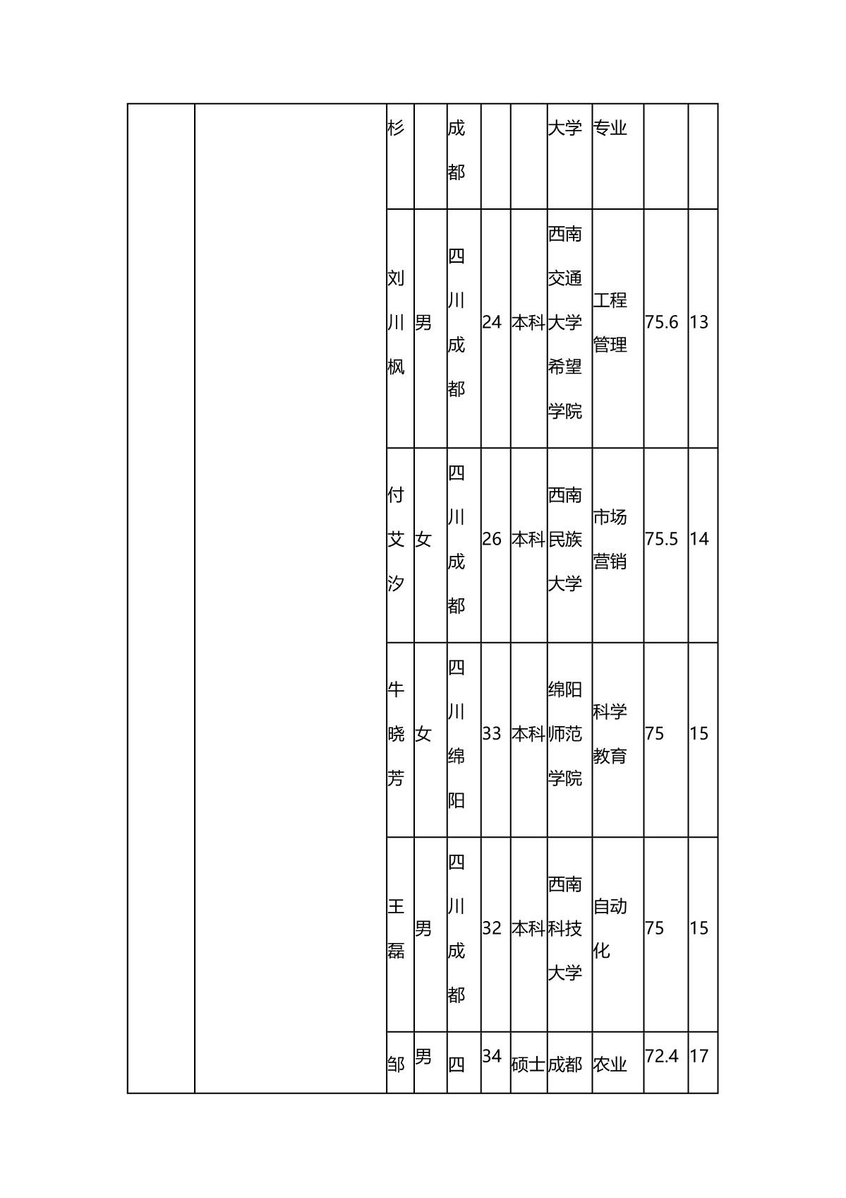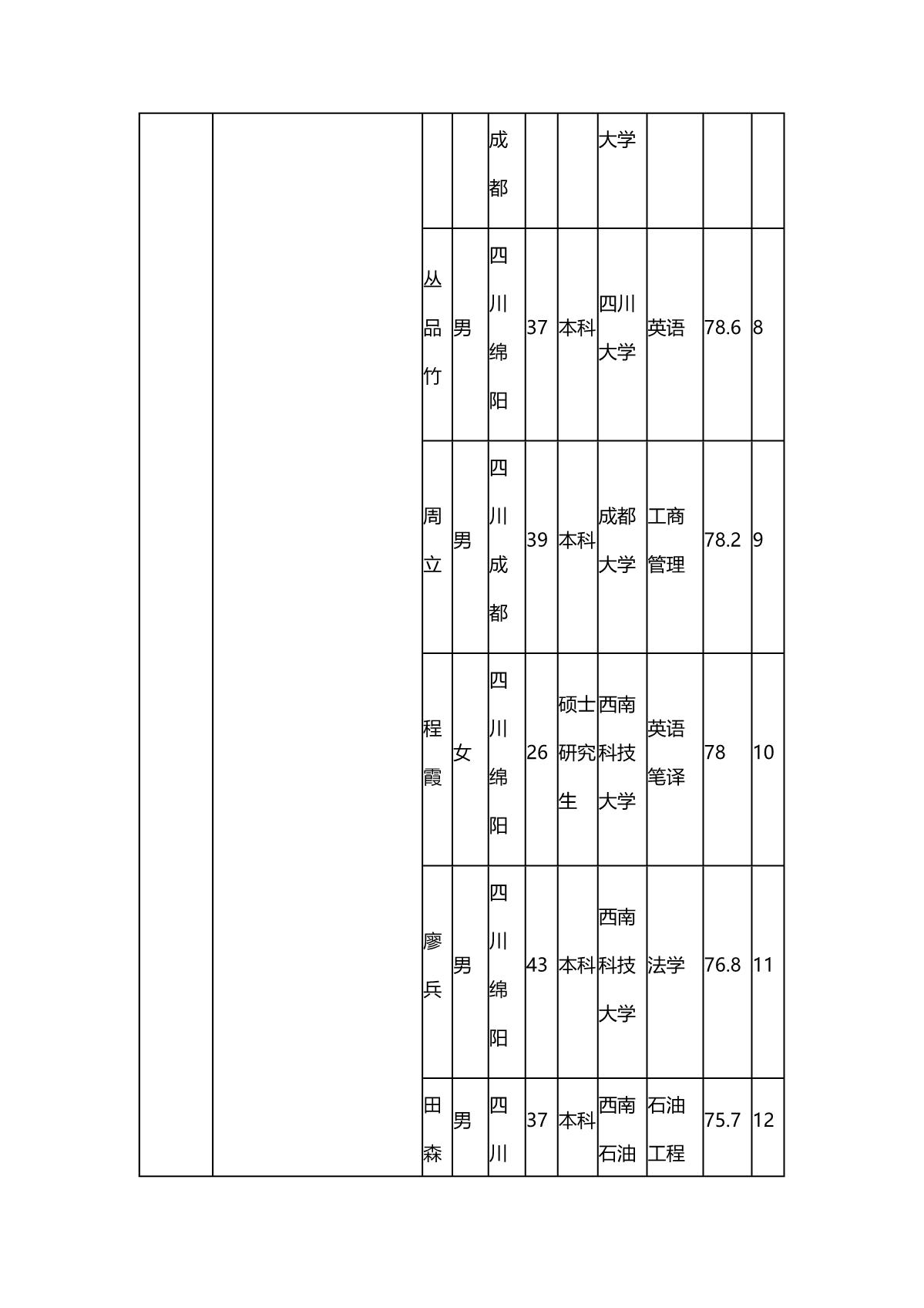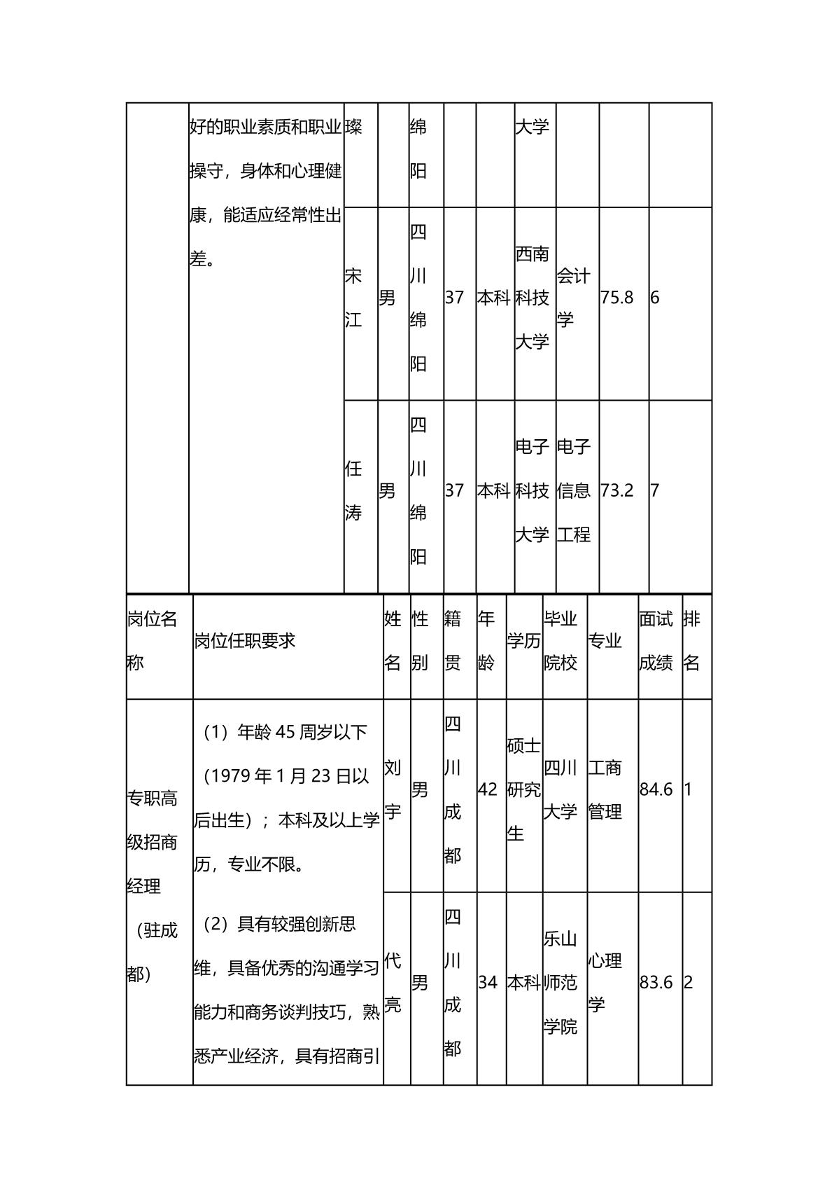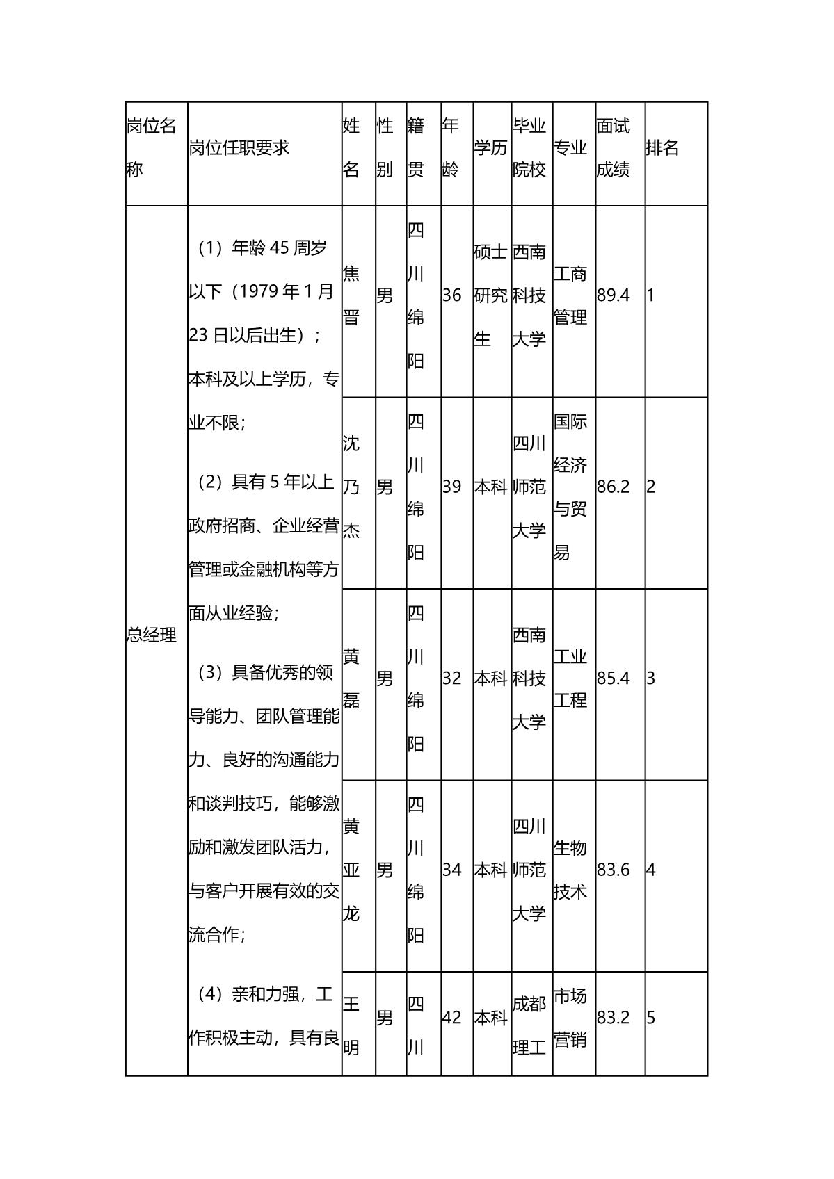 根據(jù)綿陽人才集團(tuán)發(fā)布的公告及相關(guān)規(guī)定,經(jīng)能力測試(能力測試不計(jì)入綜合成績排名)、面試等程序,現(xiàn)將總經(jīng)理及專職高級招商經(jīng)理(駐成都)崗位人員成績予以公示。
