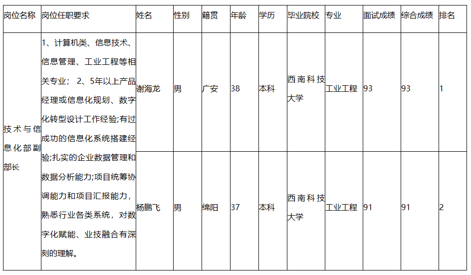 根據(jù)四川九州線纜有限責任公司發(fā)布的招聘公告及招聘相關規(guī)定,經(jīng)面試程序,現(xiàn)將面試成績予以公示。
