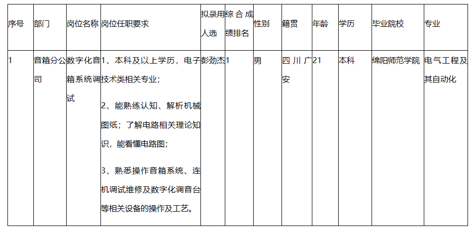 根據四川湖山電器股份有限公司發(fā)布的招聘公告及招聘相關規(guī)定,經筆試、面試、考察、體檢等程序,擬錄用彭勁杰同志到四川湖山電器股份有限公司工作,現予以公示,具體情況如下: