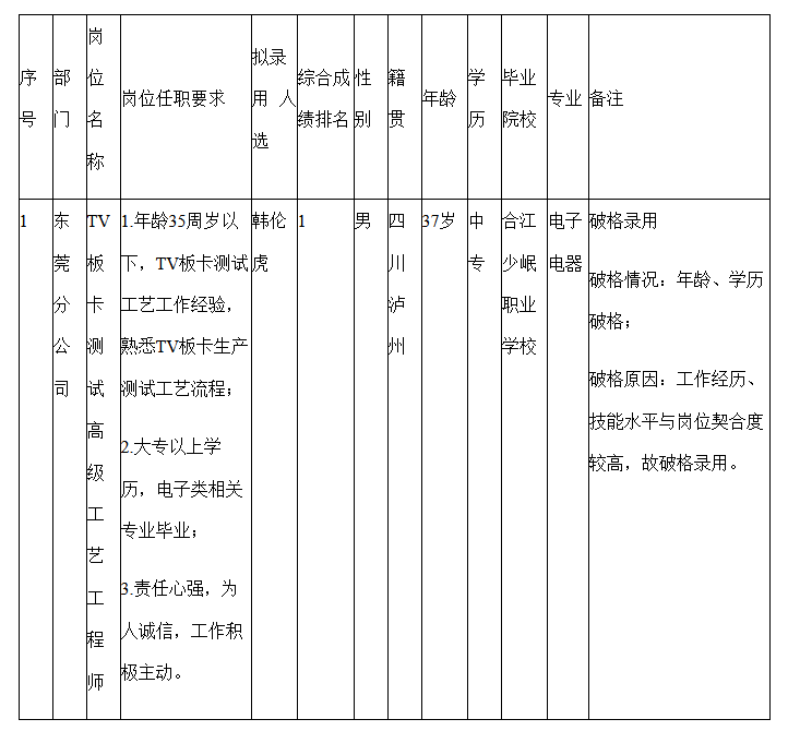 根據(jù)四川愛聯(lián)科技股份有限公司發(fā)布的招聘公告及招聘相關(guān)規(guī)定,經(jīng)筆試、面試、考察、體檢等程序,擬錄用韓倫虎同志到東莞分公司任職TV板卡測(cè)試高級(jí)工藝工程師,現(xiàn)予以公示,具體情況如下: