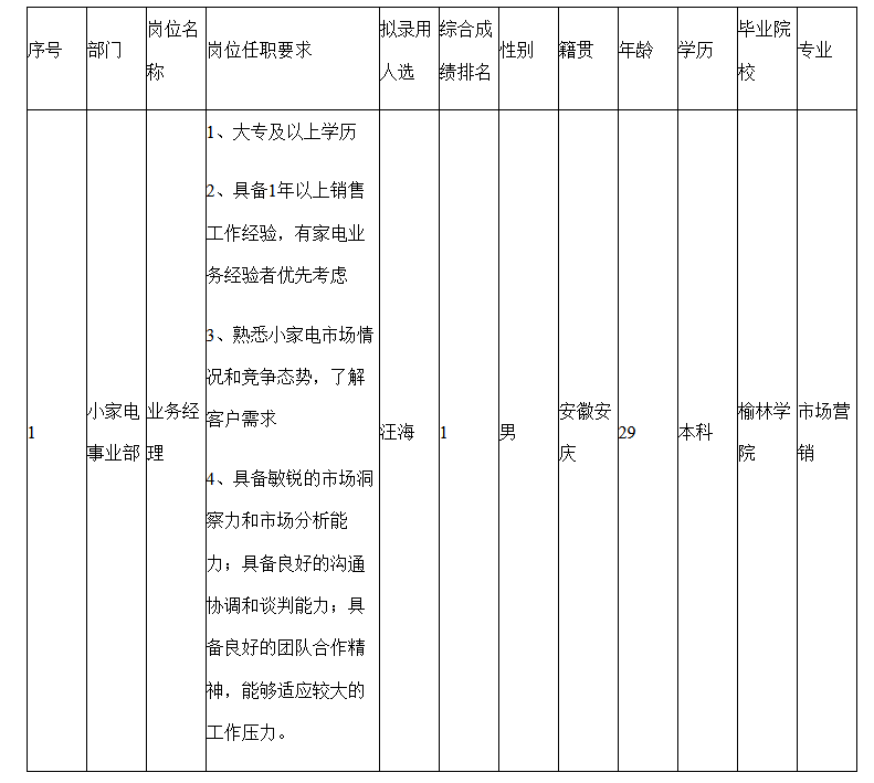 根據(jù)公司經(jīng)營(yíng)管理需要,小家電事業(yè)部招聘業(yè)務(wù)崗位1人,經(jīng)簡(jiǎn)歷篩選、面試、體檢等程序,汪海滿足錄用條件,現(xiàn)予以公示。