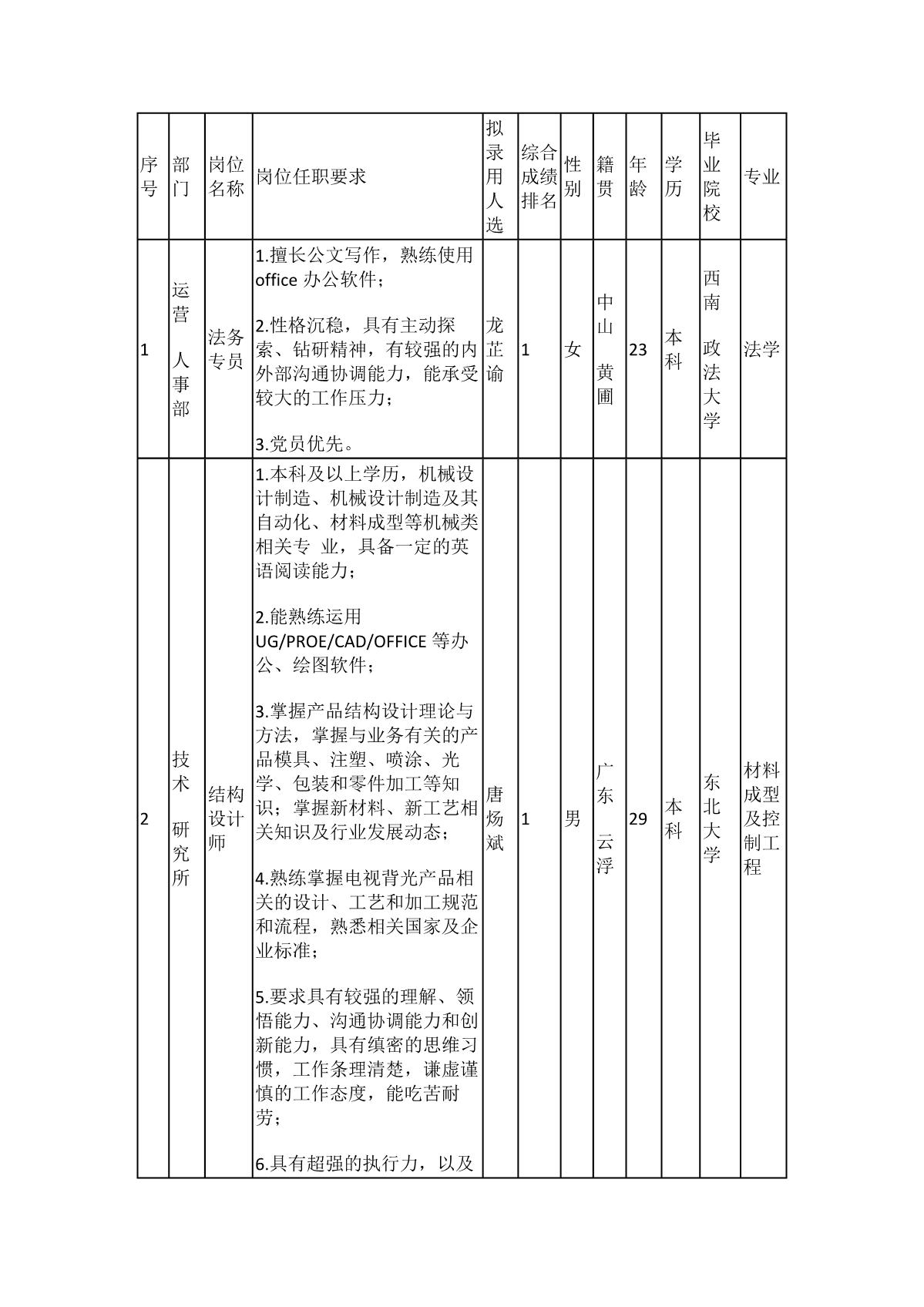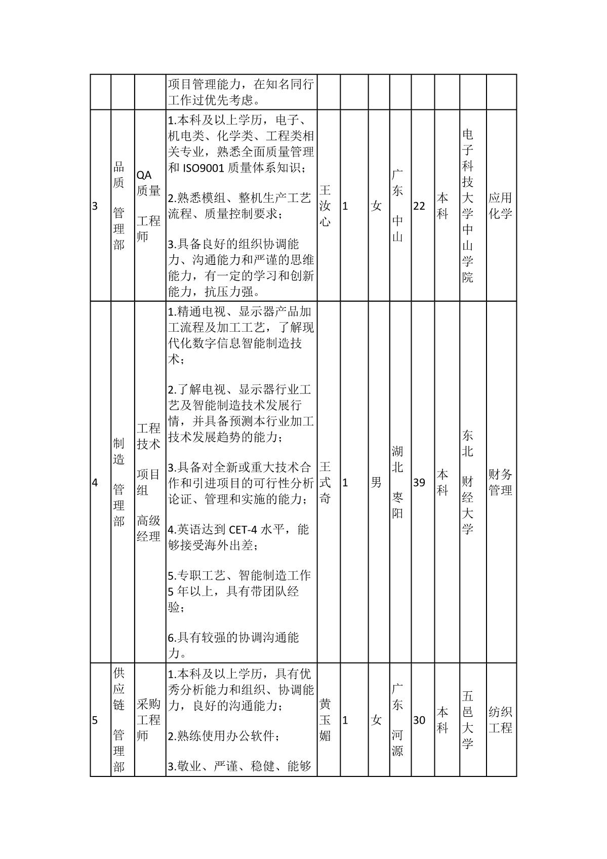 根據(jù)廣東長(zhǎng)虹電子有限公司發(fā)布的招聘公告及招聘相關(guān)規(guī)定,經(jīng)面試、考察、體檢等程序,擬錄用龍芷諭同志到運(yùn)營(yíng)人事部工作、唐煬斌同志到技術(shù)研究所工作、王汝心同志到品質(zhì)管理部工作、黃玉媚同志到供應(yīng)鏈管理部工作、王式奇、黃濤樺同志到制造管理部工作,現(xiàn)予以公示,具體情況如下: