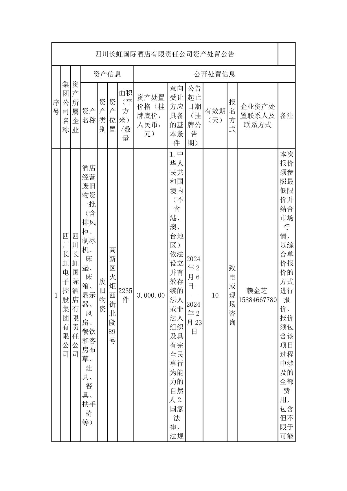 四川長虹國際酒店有限責任公司資產(chǎn)處置公告