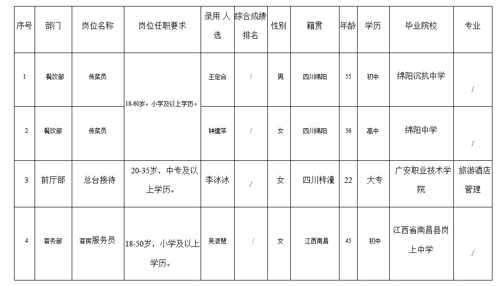 根據(jù)綿陽富樂山九州國際酒店有限公司發(fā)布的招聘公告及招聘相關(guān)規(guī)定,經(jīng)面試、體檢等程序,錄用王定合等4名同志到餐飲部、前廳部、客務(wù)部工作,現(xiàn)予以公示,具體情況如下: